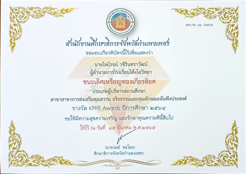 รางวัลชนะเลิศเหรียญทองเกียรติยศ สาขาการส่งเสริมคุณธรรม จริยธรรมและคุณลักษณะอันพึงประสงค์ |
