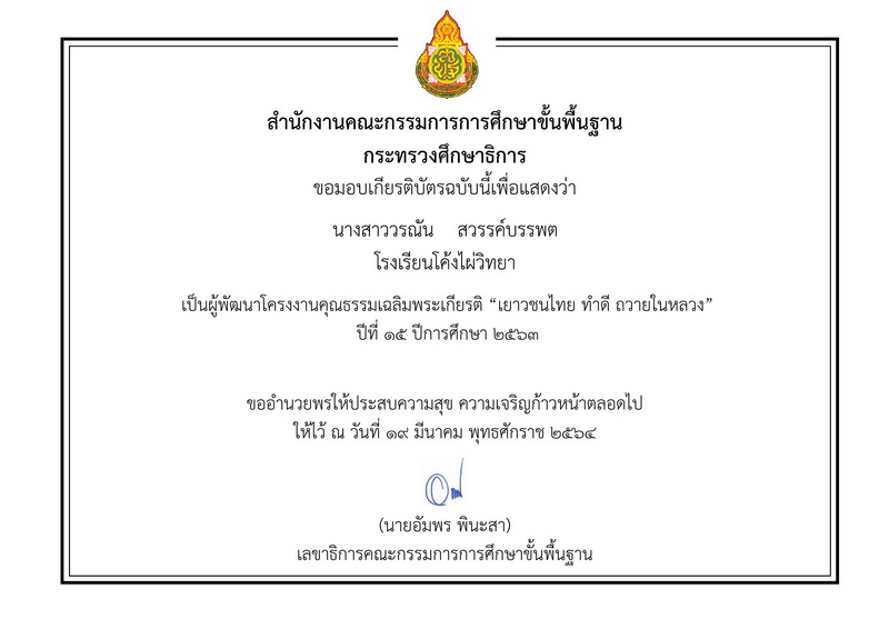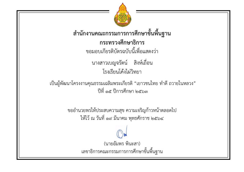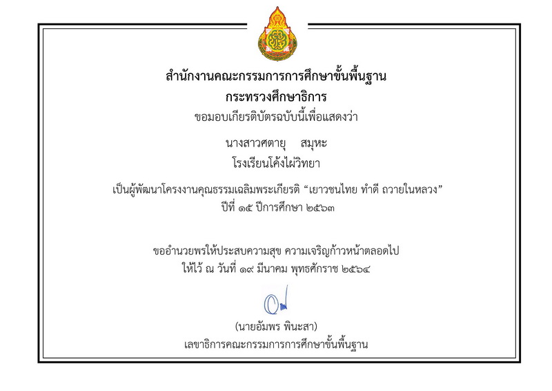 ผู้นำโครงงานคุณธรรมเฉลิมพระเกียรติ “เยาวชนไทย ทำดี ถวายในหลวง” ปีที่ 15 ปีการศึกษา 2563