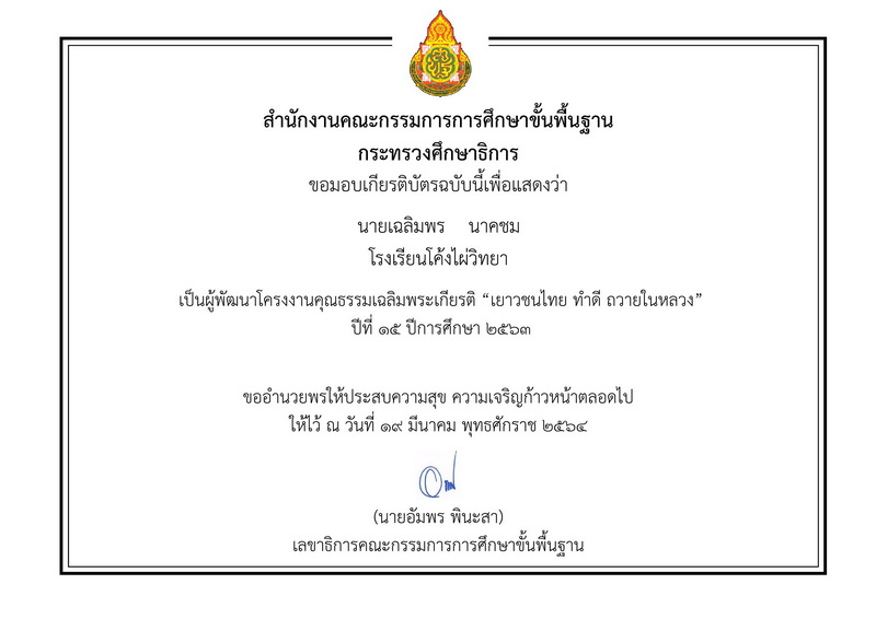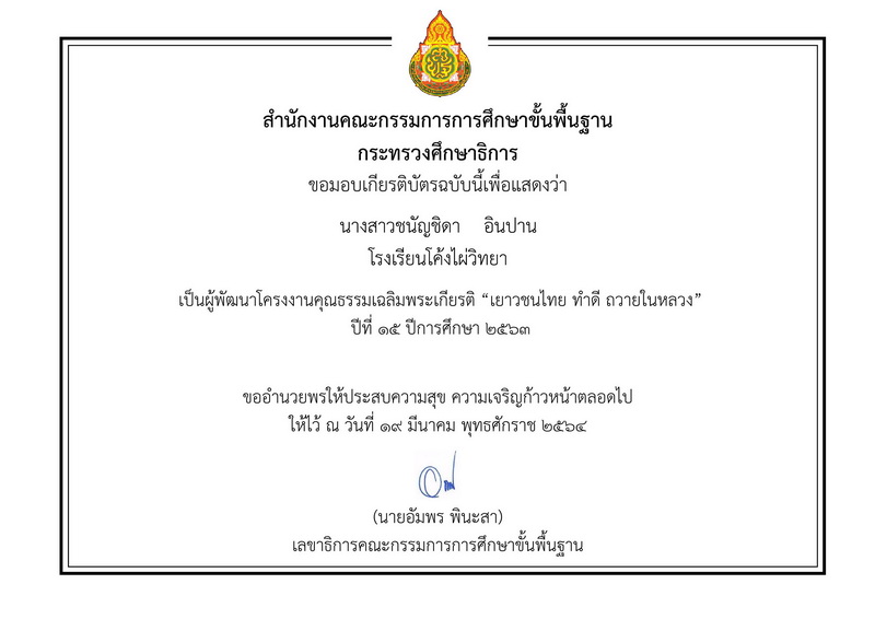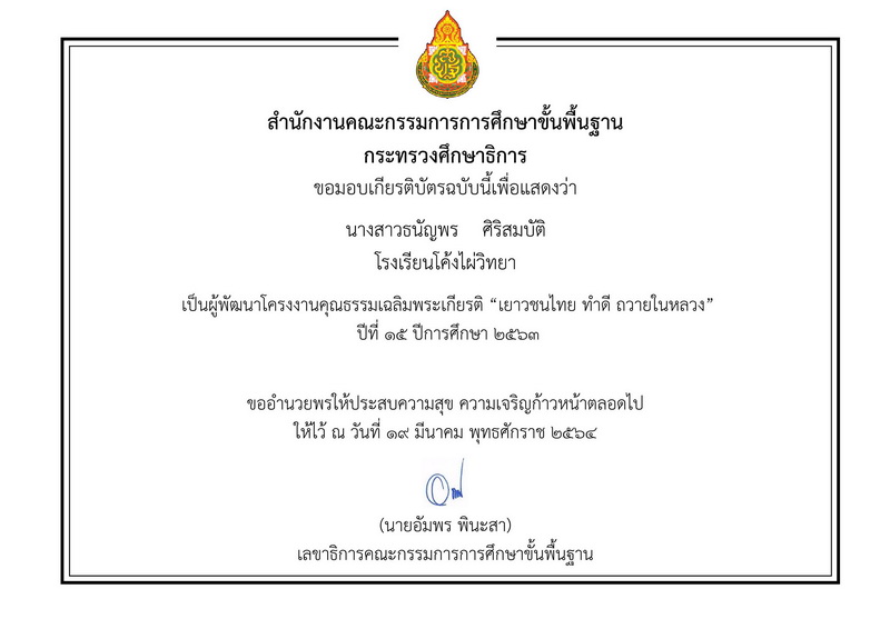 ผู้นำโครงงานคุณธรรมเฉลิมพระเกียรติ “เยาวชนไทย ทำดี ถวายในหลวง” ปีที่ 15 ปีการศึกษา 2563