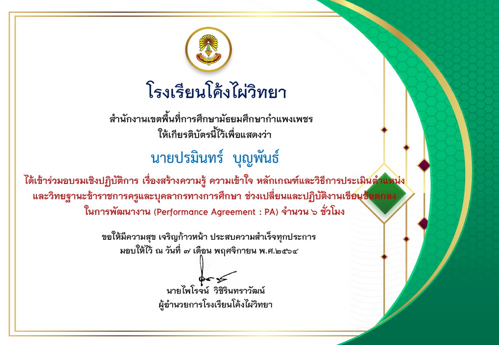 อมรมเชิงปฏิบัติการ เรื่องสร้างความรู้ความเข้าใจหลักเกณฑ์และวิธีการประเมินตำแหน่ง และวิทยฐานะข้าราชการครูและบุคลากรทางการศึกษา ปฎิบัติงานเขียนข้อตกลงในการพัฒนางาน (Performance Agreement : PA) |